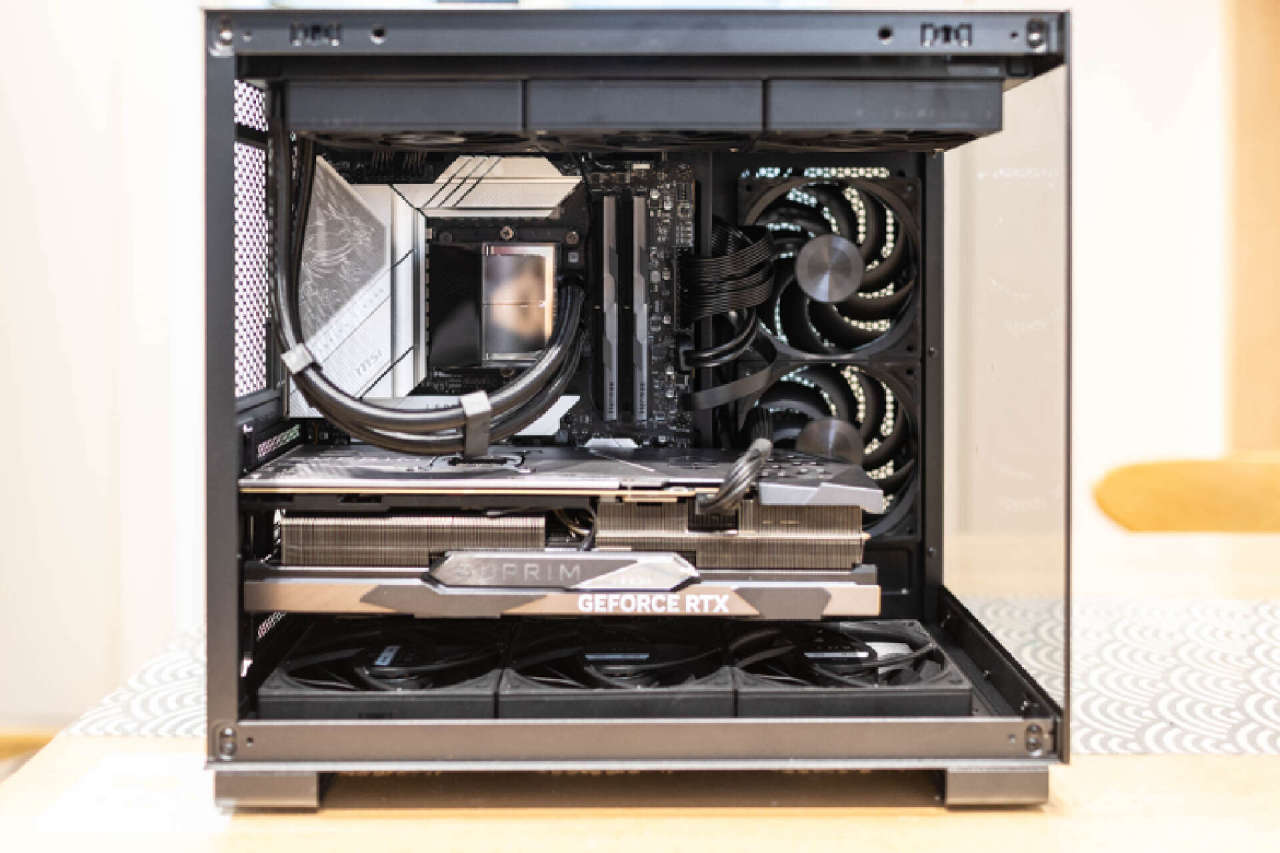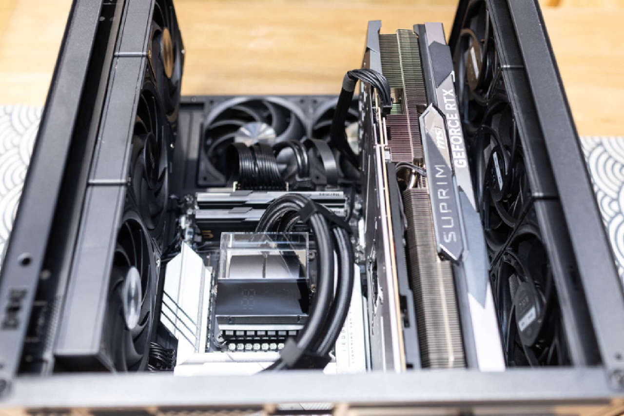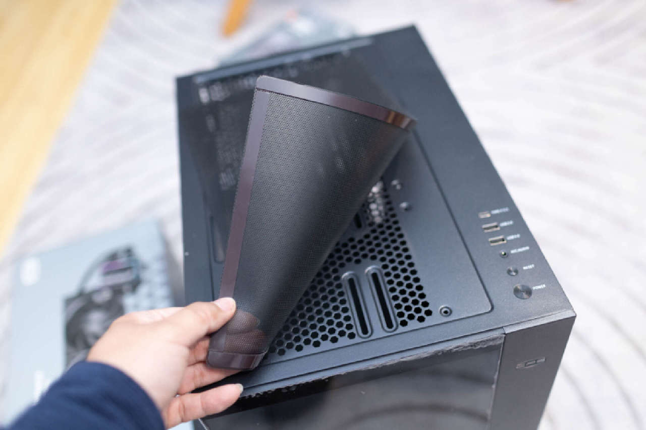 机箱采用的垂直风道+侧后辅助散热的方案,机箱顶部支持360水冷的安装,并覆盖有一张全尺寸磁吸防尘网,后期维护非常便利。