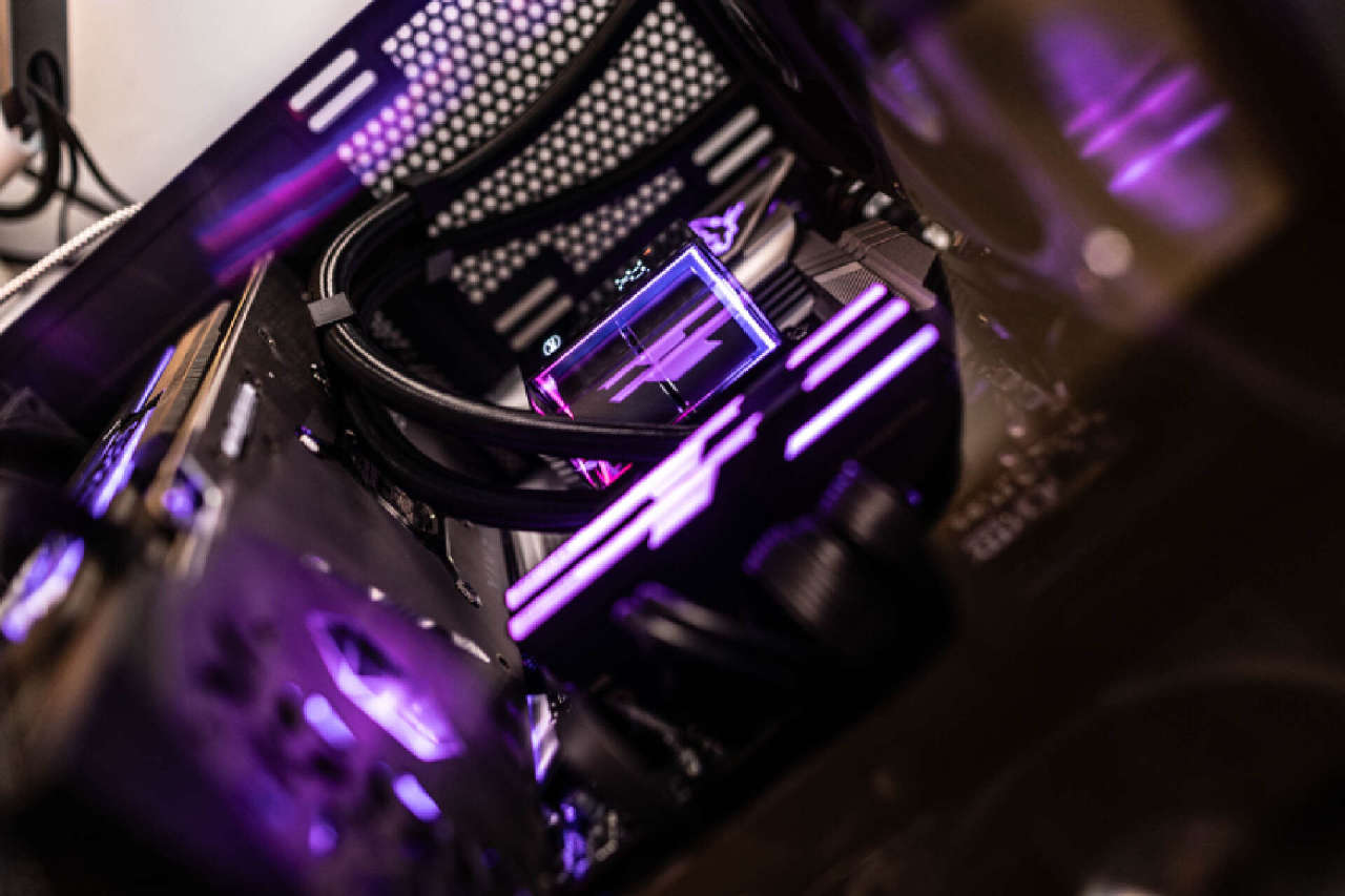 水冷散热器方面,这次选择的是超频三的DS360 数显水冷。这款散热器配置了性能强悍的双腔体水泵,泵体外壳采用CNC工艺制作,冷头右侧采用了透明腔体,内置ARGB无限镜灯效,支持温度显示功能,点亮后颜值极高,个性十足