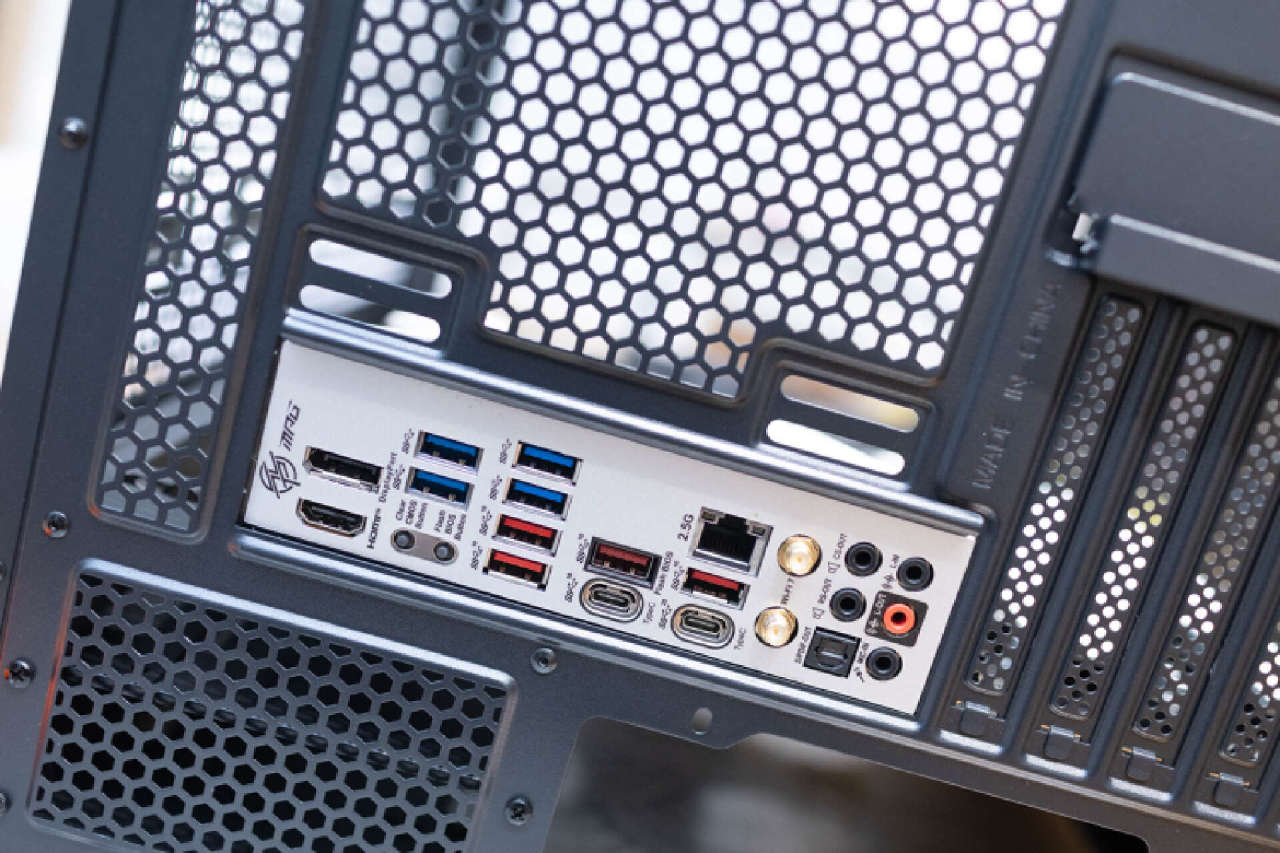 主板提供了1个DP和1个HDMI接口,数据接口包含4个USB 3.1接口及4个USB 3.2 Gen 1 Type-A接口,1个USB 3.2 Gen 1 Type-C接口以及1个USB 3.2 Gen2*2 Type-C接口。网络音频接口方面,包含1个2.5G有线网卡接口,1组Intel最新WiFi7无线网卡的天线接口。除此之外还提供了1个清除CMOS设置按键和1个不点亮刷新BIOS按键,超频体验直接拉满。