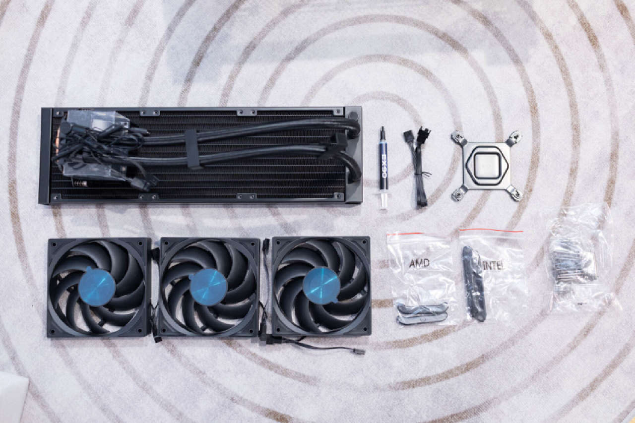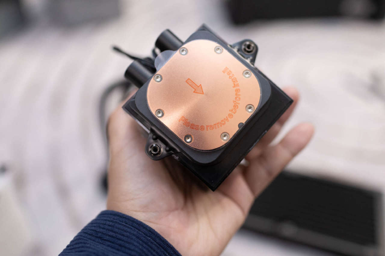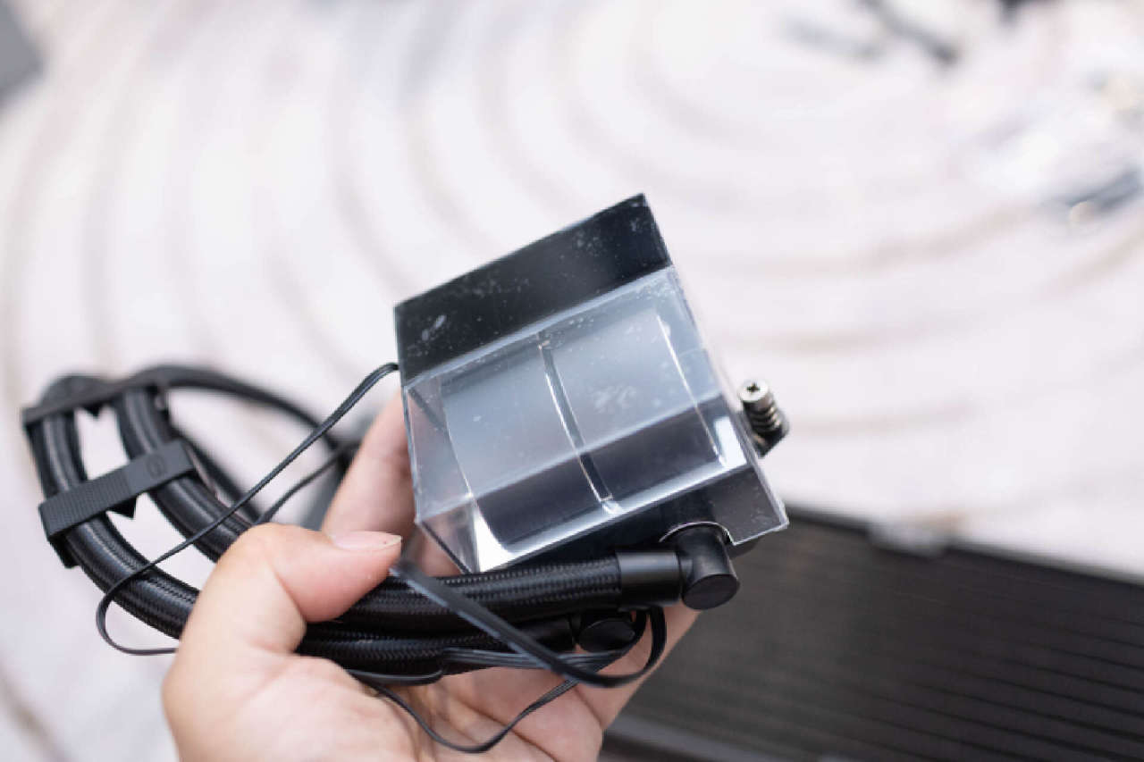 DS360的冷头采用了专门应对高端处理器而研发的全新双腔体水泵方案,能够有效提升水冷液的流速与流量,官方数据显示可以轻松压制功耗300W的I9 14900K处理器。高透全景视窗设计配合方中有圆的组合极具视觉冲击力,更可以让玩家对冷头的内部CNC铝合金泵结构一览无遗。