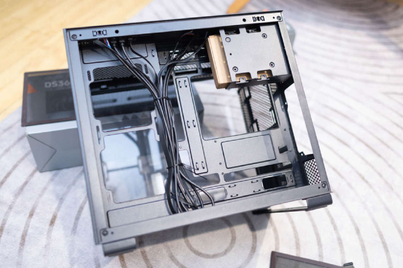 机箱副仓的空间相当充裕,中置的电源安装位可以支持ATX标准尺寸大电源,并且还提供了一个全金属硬盘支架,可以安装2*HDD和2*SDD。