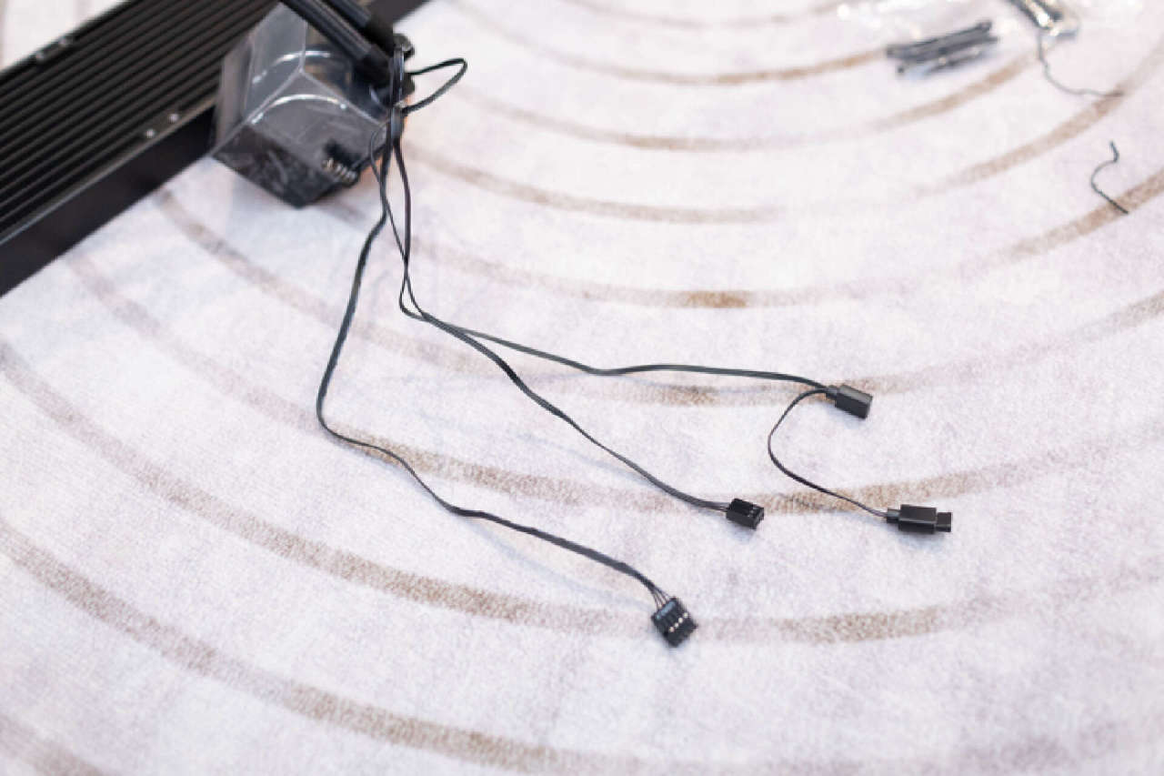 冷头背部提供了3根数据线,除了常见的3Pin 12V水泵供电和3Pin ARGB信号线外,还提供了一根USB数据线。