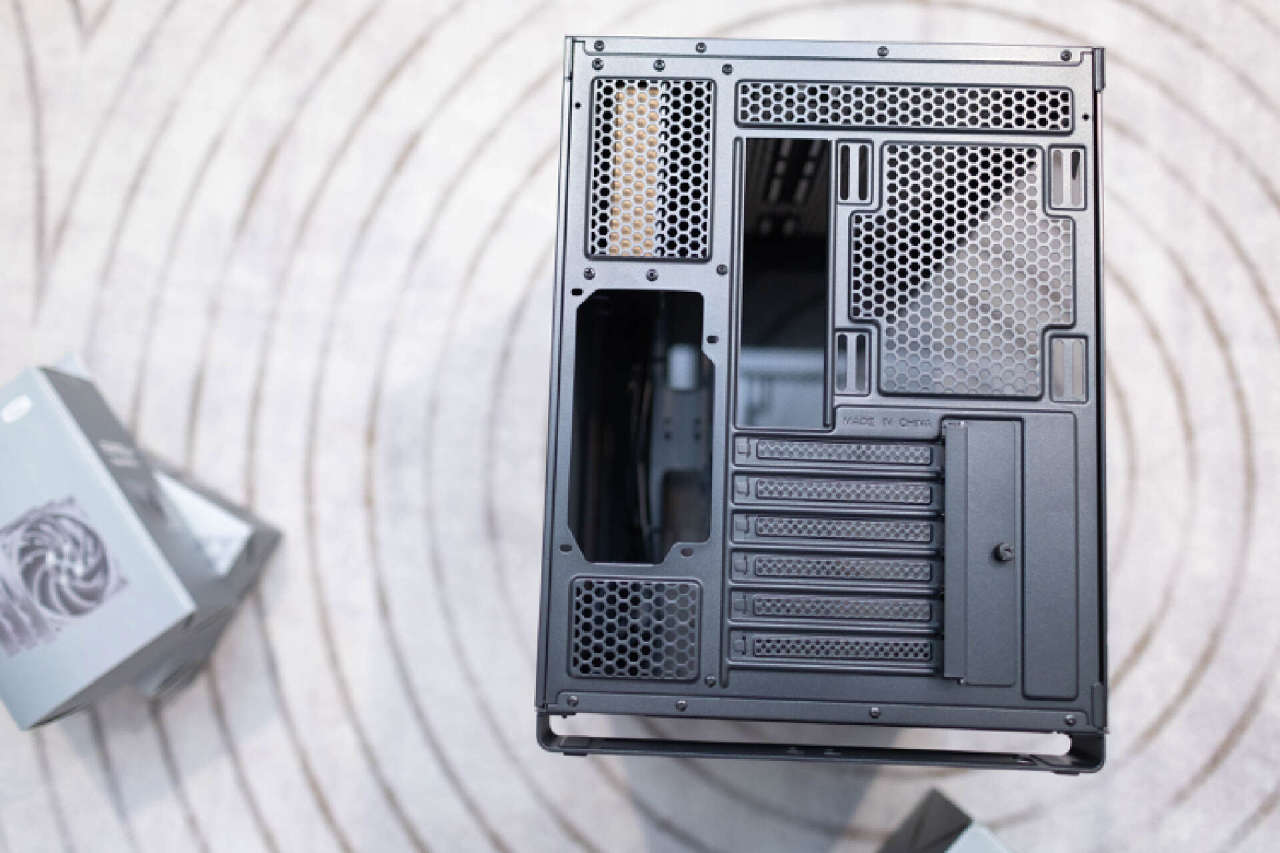 机箱背部可以看到标准的左右分仓结构,主仓提供了6PCI扩展空间,副仓电源位置处于中下方。