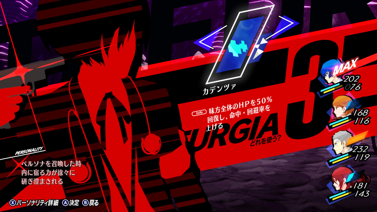攻击敌人的弱点使敌人倒地后,可发动“1MORE”再次进行攻击,让所有敌人倒地即可发动的总攻击。极具《女神异闻录》系列特色的指令制战斗在本作中变得更加爽快刺激。
