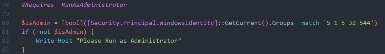 判断当前终端是否使用管理员权限打开,S-1-5-32-544为Windows内置管理员组的SID。如果不是管理员权限打开,则提示用户