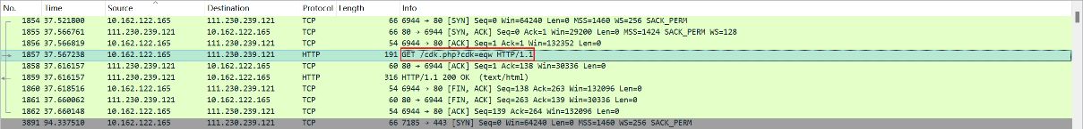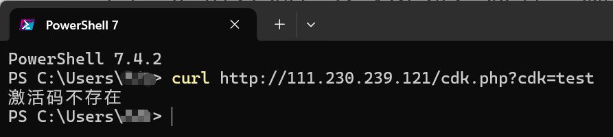 通过抓包发现,输入盗版cdk之后,该exe文件会向“111.230.239.121“发起一个GET请求。接口为”/cdk.php”,请求参数为”cdk=盗版cdk值进行后台校验”。