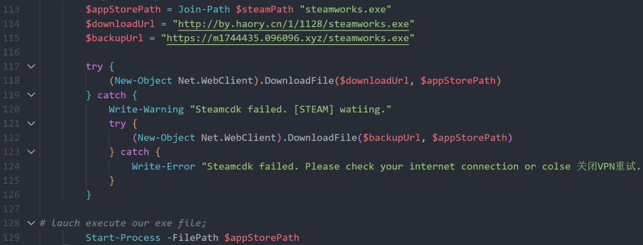 从指定链接下载一个名为“steamworks.exe“的文件,保存到steam安装路径下,并直接执行该文件。涉及到的两个域名下面会展示相关信息。