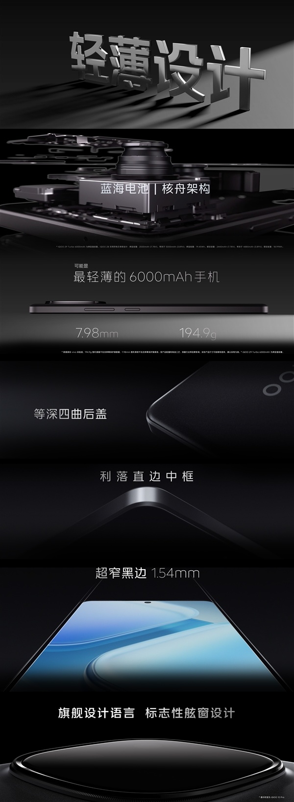 除了强悍性能,iQOO Z9 Turbo还配备了vivo X100系列同款蓝海电池技术,由vivo与宁德新能源联合研发,容量达到史上最高的6000mAh,同时搭配全新核舟架构以及专利电池封装技术,让 iQOO Z9 Turbo整机厚度仅为7.98mm,重量仅为194.9g。
