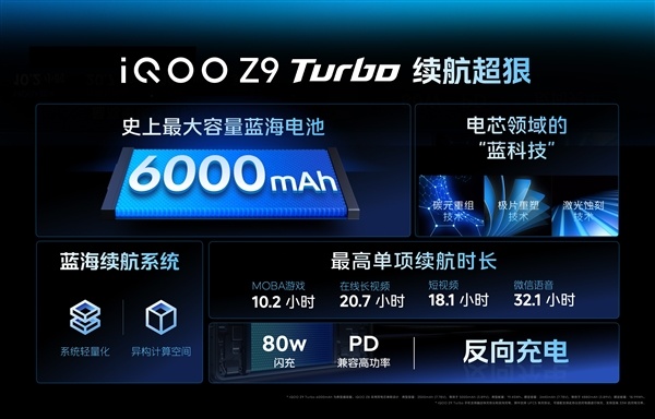 并且iQOO Z9 Turbo支持80W闪充,最快5分钟充入1000mAh电量,还有7.5W有线反向充电,可为亲友的设备供电。