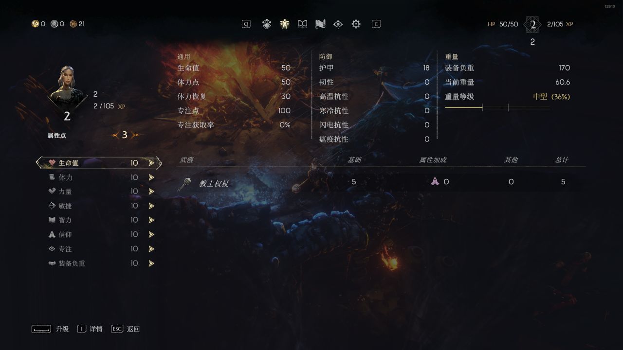 升級可加的屬性爲:生命值、體力、力量、敏捷、智力、信仰、專注、裝備負重
