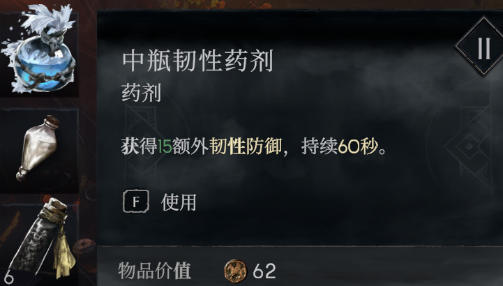 藥瓶可以通過搜刮和製作獲得,遊戲中可以喫藥增加一定的人物基礎屬性。藥有低、中、高三個等級,每個等級獲得的屬性點不同,等級越高獲得越多。
