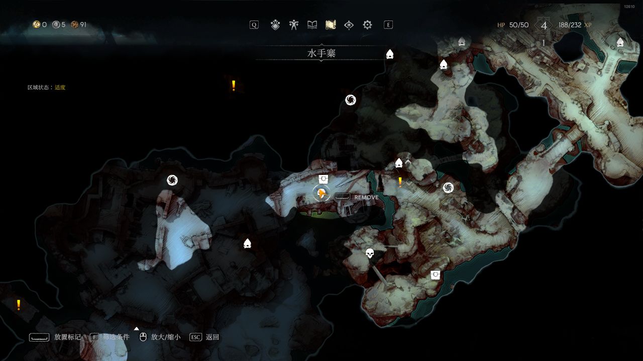 地圖的畫風是寫實風格,比較清晰可見。在探索地圖的過程中,由黑色的未知區域探索爲已知的區域。但是經過一段時間後,已知區域會變爲灰色,代表地圖資源、寶箱、敵人等已經刷新。