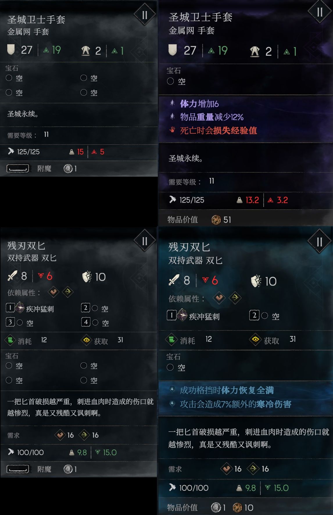 在聖城埃莉諾處,可以對武器和護甲附魔,將白色品質升級到藍色或者紫色品質,此操作會移除最近的2個符文槽位和最近的3個寶石位,一旦確認將無法撤銷。