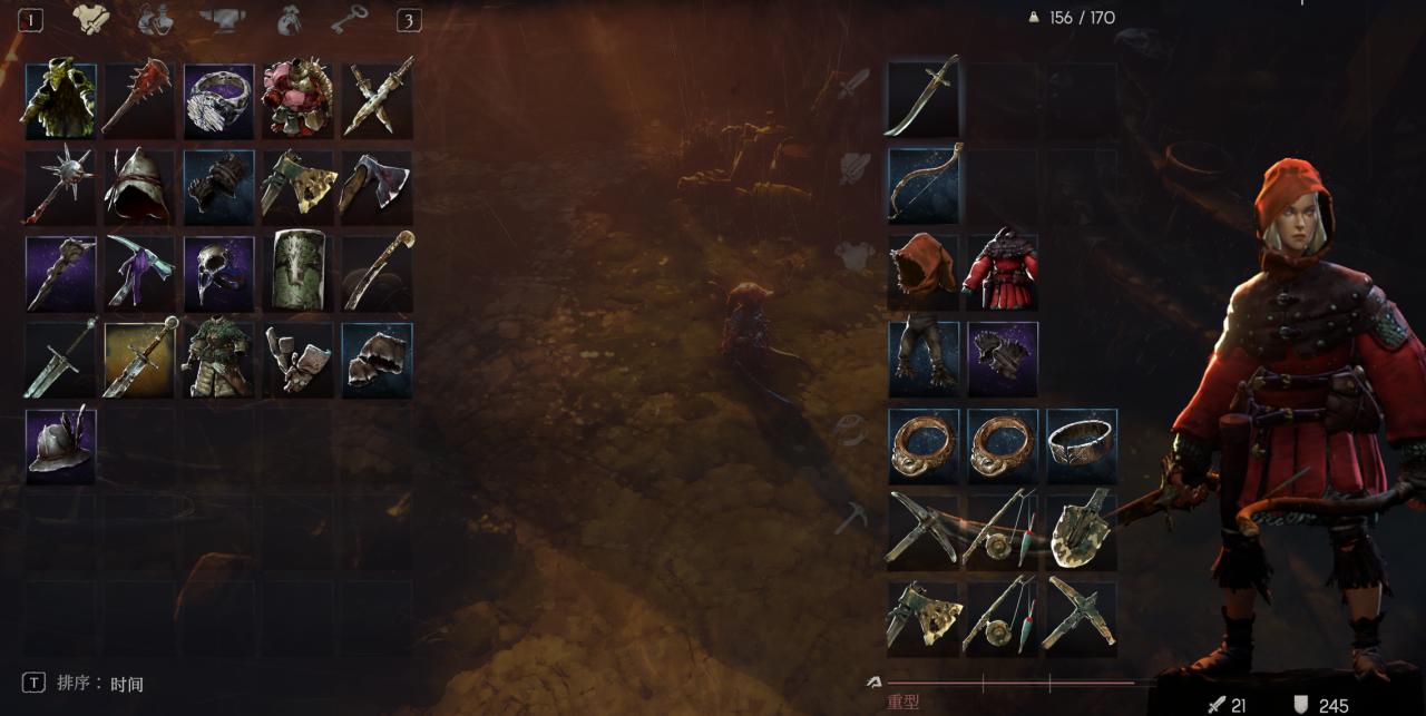 左邊是揹包,第一類揹包放着武器、護甲、戒指、資源採集工具。對應右邊的裝備欄,第一排主武器欄,第二排副武器欄,第三四排護甲欄,第五排戒指欄,第六七排資源採集工具欄。