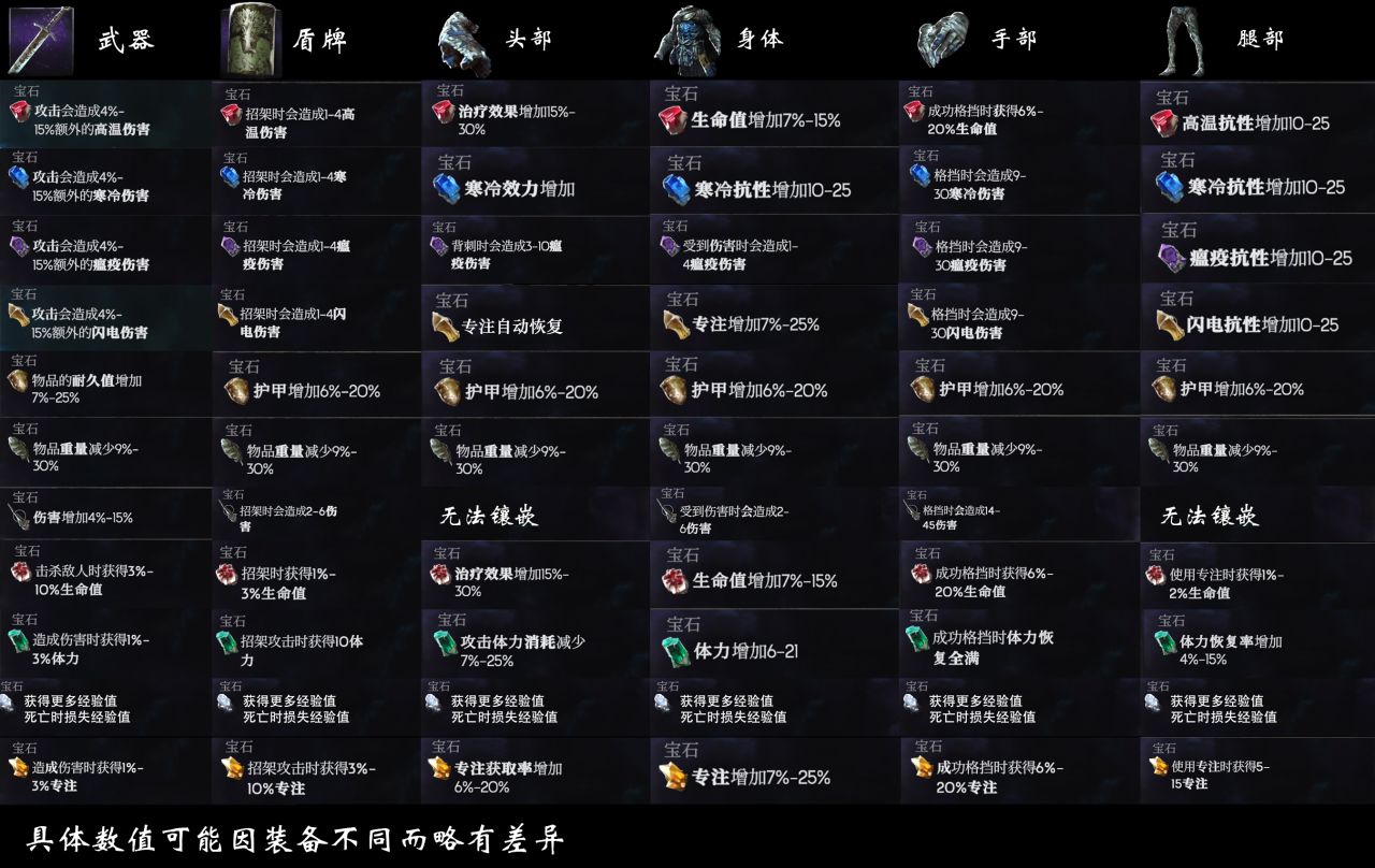 在聖城埃莉諾處,可以在武器和護甲上鑲嵌寶石。寶石的效果如下,圖片借用於黑盒“深巖集團底層礦工”