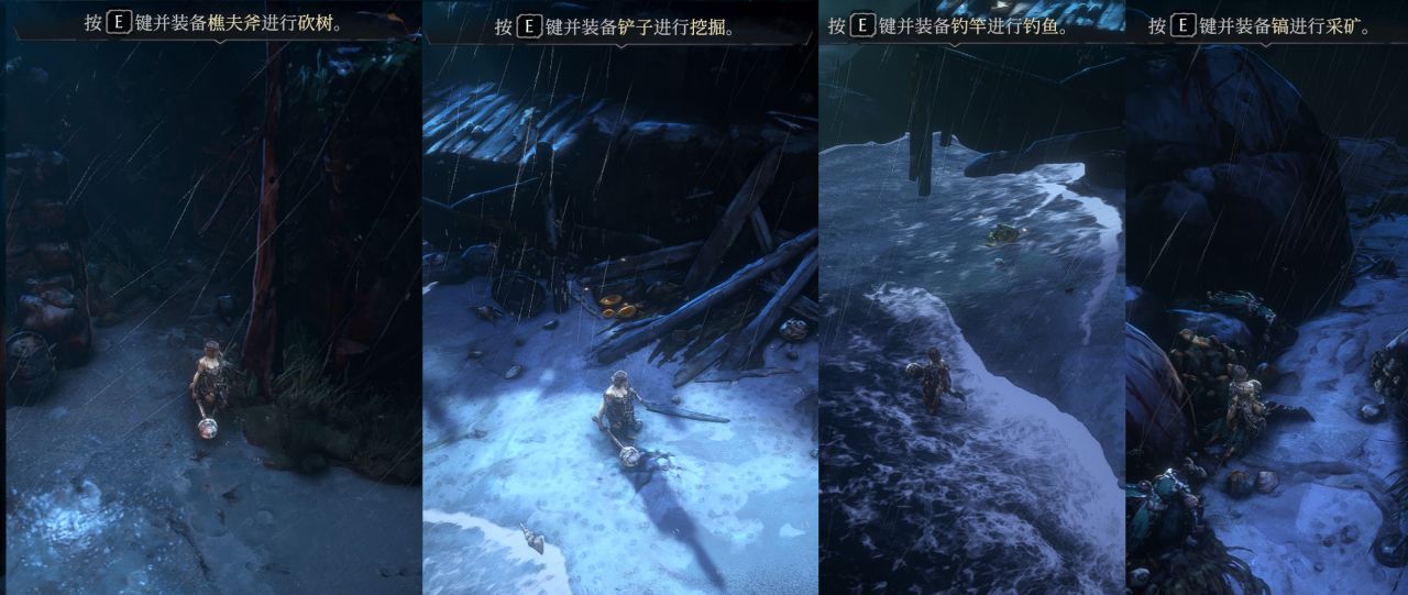 遊戲中有魚、木頭、礦石、土堆等資源,需要用魚竿釣魚、斧頭砍樹、稿子挖礦、鏟子挖土。