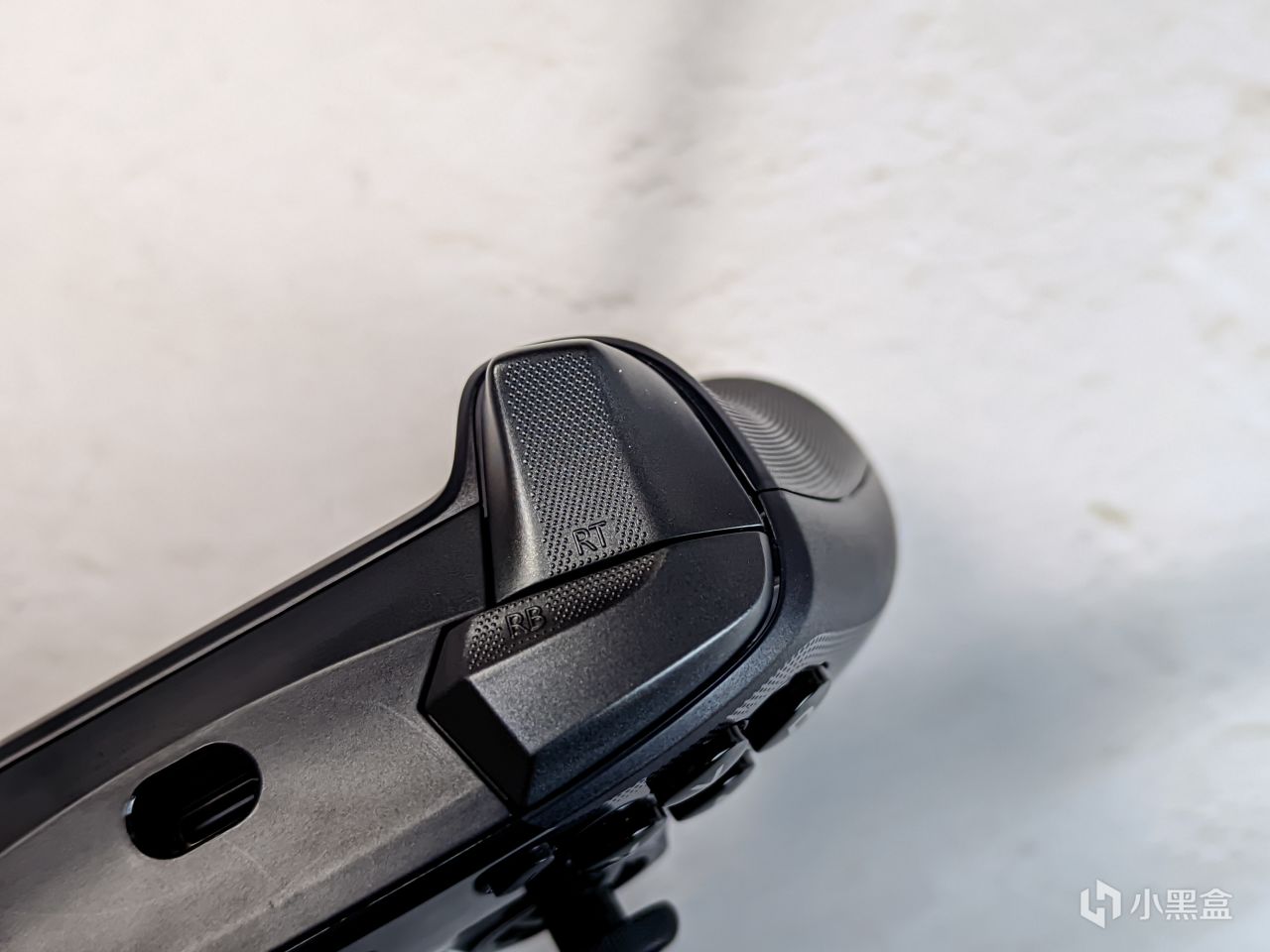 视角拉高,让我们看看顶部,影舞者的顶部配有一对肩键以及霍尔扳机,肩键的左右声还算接近,不知道后续表现怎么样,霍尔扳机部分则是采用了线性扳机,空程较少,同时其配合微软官方的原生震动表现,还是非常舒服的。