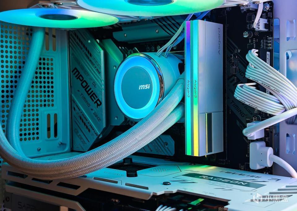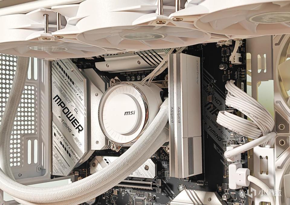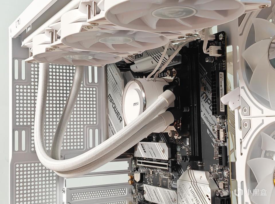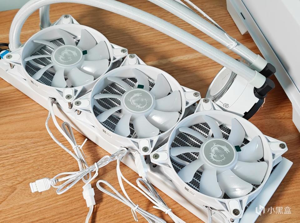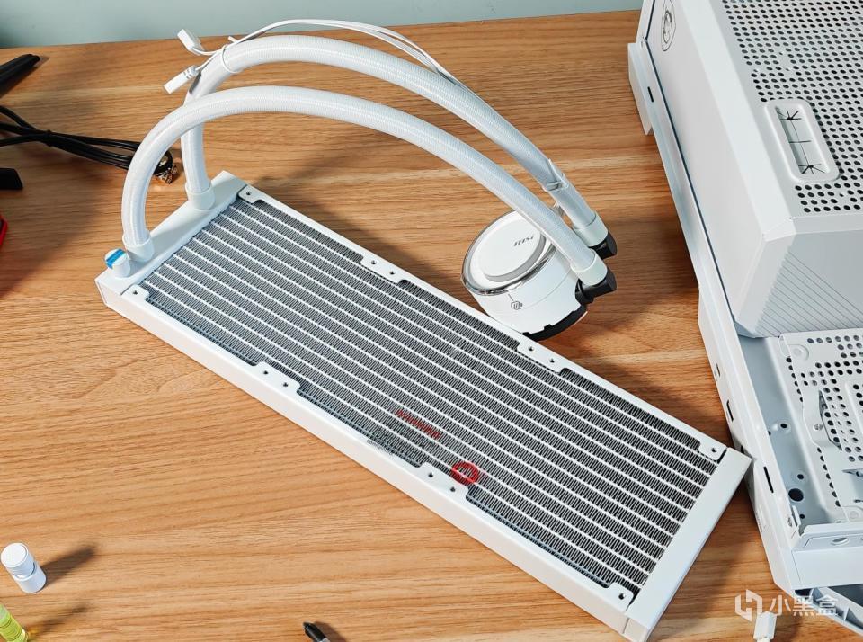 水冷散熱器是微星的360水冷MAG CORELIQUID E360 WHITE,一款白色360水冷。這款水冷是全白色的,冷排、水管、冷頭包括線材都是白色。