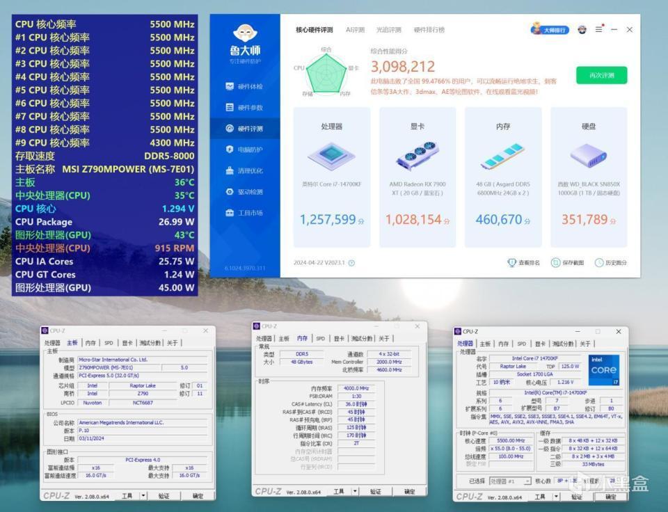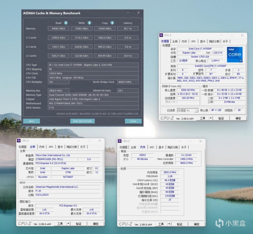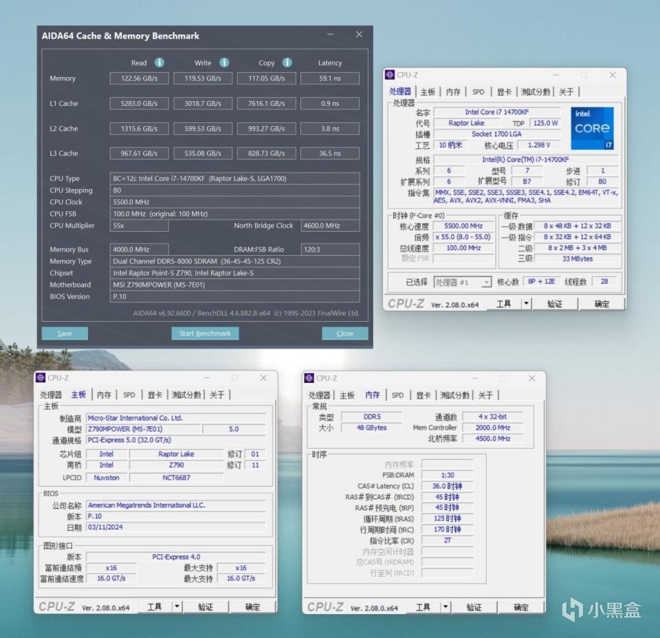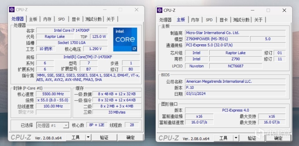 運行CPU-Z,我們看正確識別出處理器是i7-14700KF,頻率5500MHz,主板是微星Z790MPOWER。