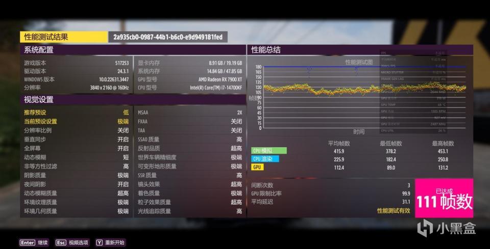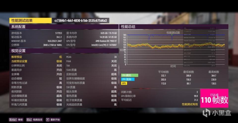 再換一個遊戲,地平線5,8000MHz時候CPU模擬平均幀數是415.9,CPU渲染平均幀數是225.9。