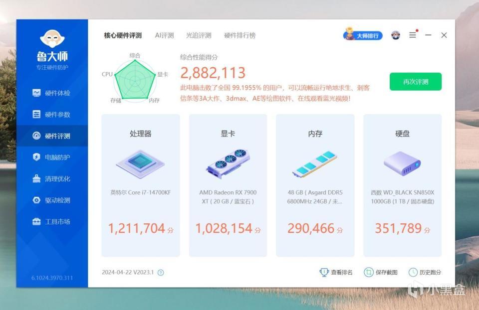 運行魯大師,內存得分繼續有所提升到了460,670,系統總分接近了310萬分。