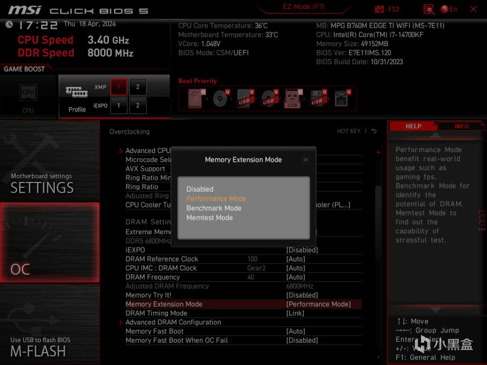 微星的主板還具有內存增強模式,在內存頻率不變的情況下繼續提升性能,我們嘗試下,選擇了增強模式下的Performance Mode。