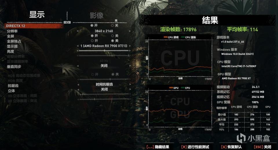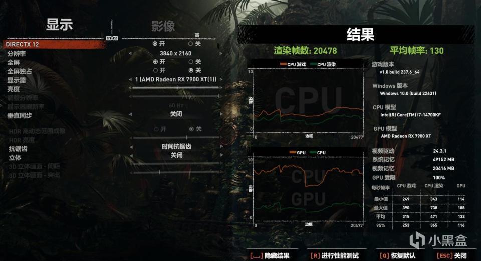 首先是古墓麗影.暗影,我們看這裏面的CPU遊戲平均幀率是315,CPU渲染平均幀率是471。