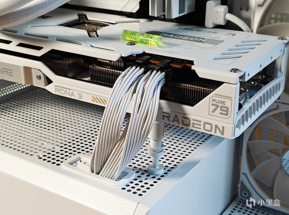 雙滾珠軸承風扇,可折角的扇葉設計可提供雙層向下風壓與軸流風扇外環的氣壓一起作用,可大幅增加風壓和氣流,運行起來更安靜且更涼爽。背面有全尺寸的金屬背板,全白色,並有多處通透設計,可以增加散熱效果。使用機箱附帶的小型顯卡支架,可以給顯卡提供良好的支撐,輔助用機箱附件裏的水平儀,可以確保顯卡處於水平。