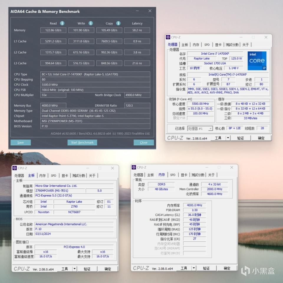 重啓電腦,順利進入系統,再次運行AIDA64和CPU-Z,我們看內存頻率已經是8000MHz。AIDA64內存測試,讀寫在101GB/s-122GB/s之間,大幅提升,而延遲則大幅減少到了58.2ns。