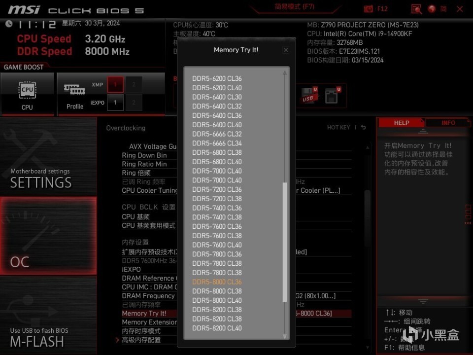 重新啓動電腦進入BIOS裏面,微星的主板具有一鍵超頻功能,我們直接將內存一鍵鈔票到8000MHz。