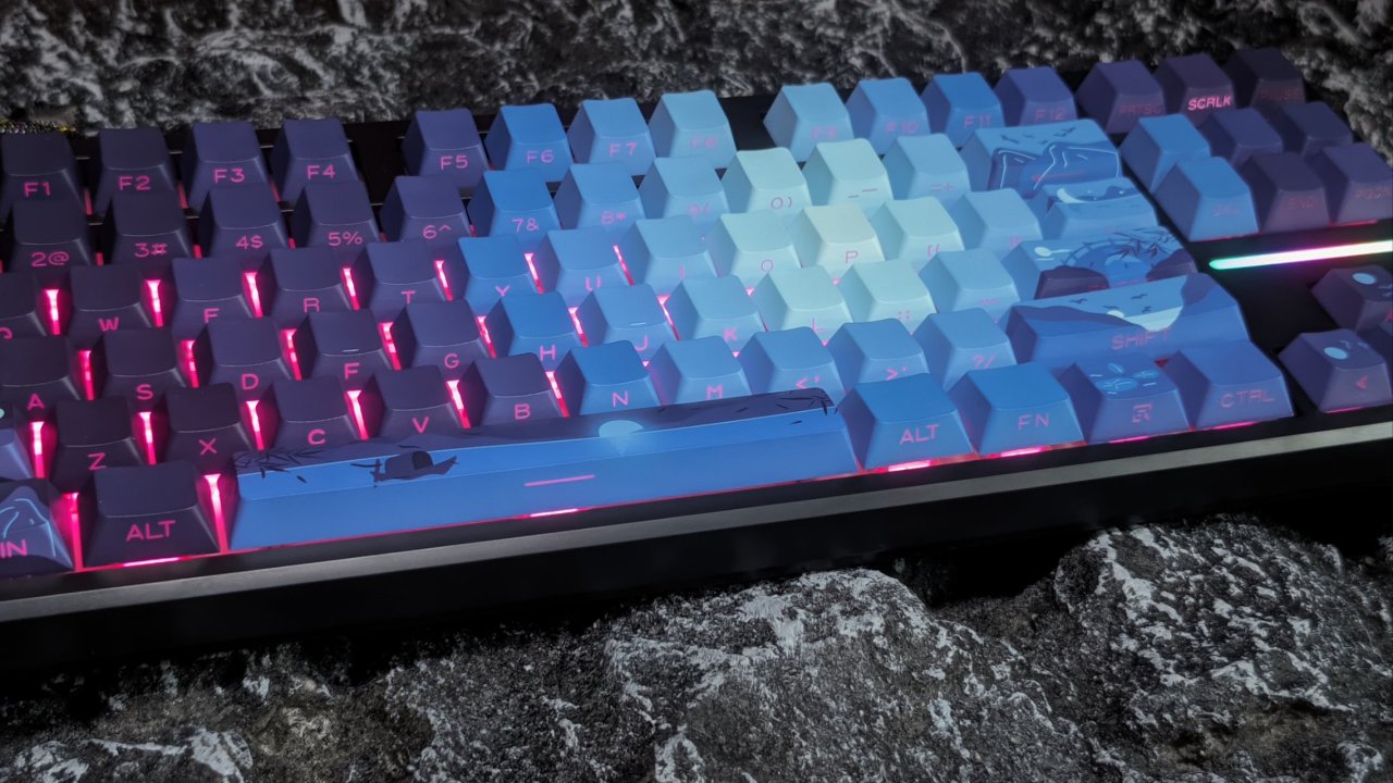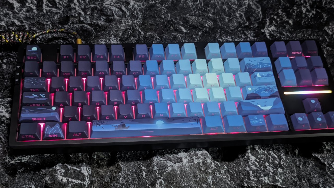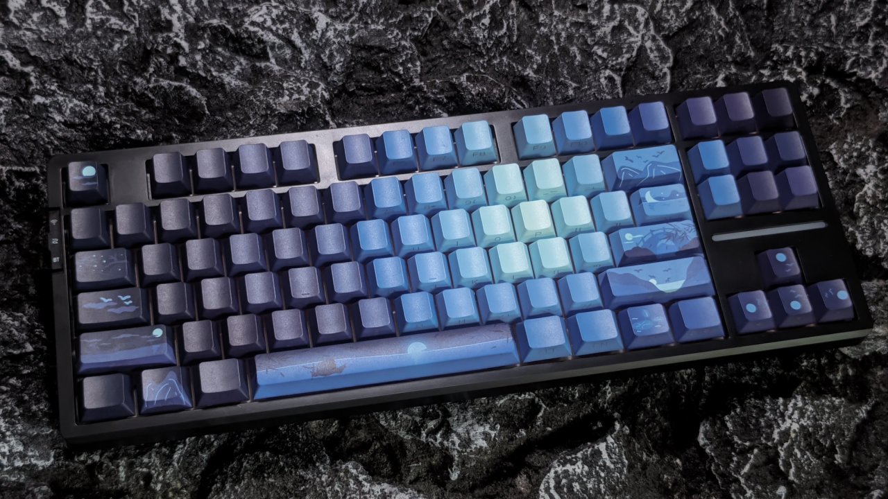 五面热升华工艺搭配浅色的处理看起来十分协调,色彩恬淡不鲜艳,孤冷又不清高,没有感受到色差,张开一看更似有一个大月亮在键盘上,心旷神怡