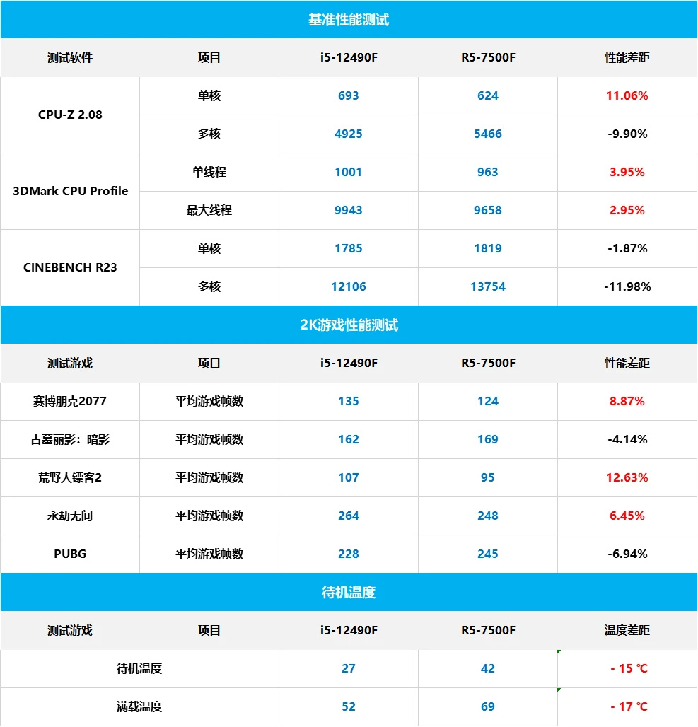 从测试结果来看i5-12490F在单核方面具有优势,而R5-7500F多核较强。而在游戏测试环节,2K分辨率下的3A大作和两款比较日常网友来看,i5-12490F和R5-7500F各有千秋,几乎不相上下,结果也体现的两者的适用场景区别,i5-12490F适合个人游戏玩家,R5-7500F则更适合生产力用途。此外,i5-12490F在散热和功耗控制方面也表现出色,在高负载运行时能够保持较低的温度和功耗,从而保证了系统的稳定性和持久性。