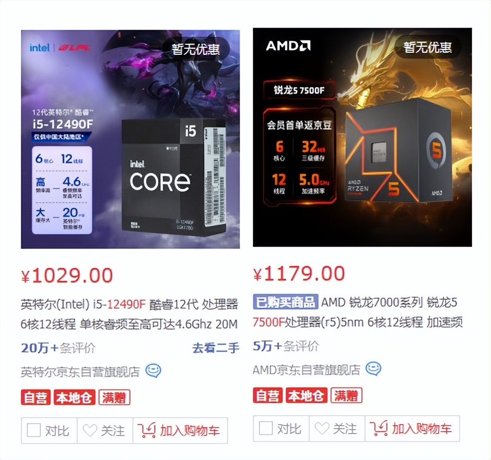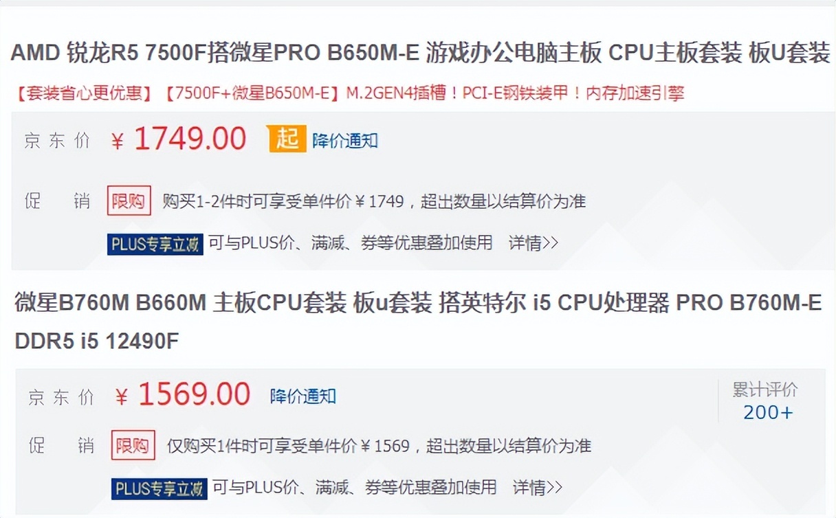 在看实际售价,目前两款CPU在JD的售价,12490F为1029元,7500F的价格为1179元,两者差价为150元。以最入门的均为DDR5内存配置的板U组合为例,7500F+最入门的B650M-E价格为1749元,而12490F+PRO B760M-E仅需1569元,两者价差为180元。
