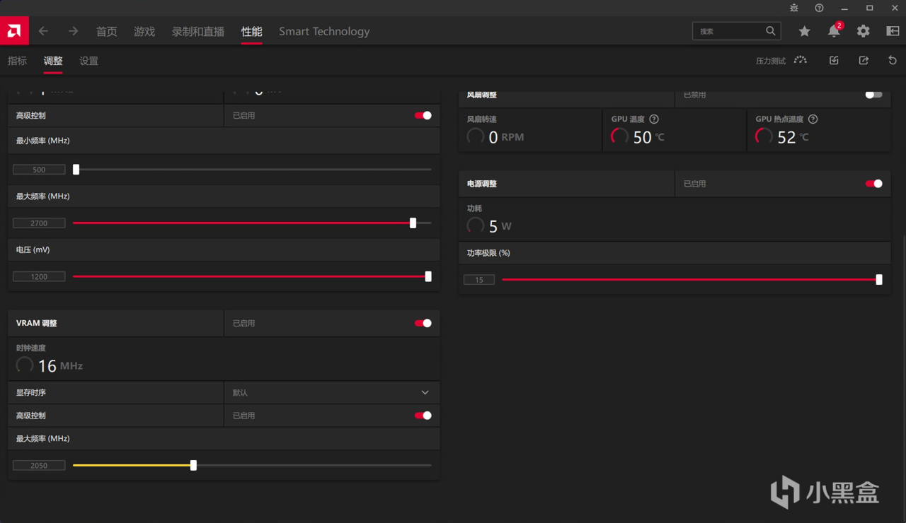 最后对其进行超频测试,超频有风险操作需谨慎,以下测试结果仅供参考,因为不同核心的体质不同,超频程度与参数不一定适用所有,显卡超频可在AMD显卡控制软件中操作,本次将核心最大频率提高至2700MHz,再往上就不稳定,显存频率提升至2050MHz,电压值与功率值拉满,风扇选择自动模式。