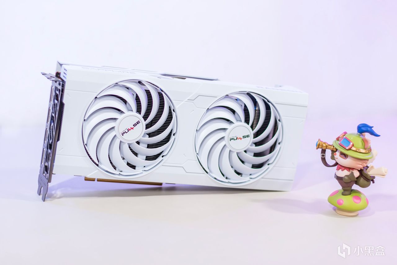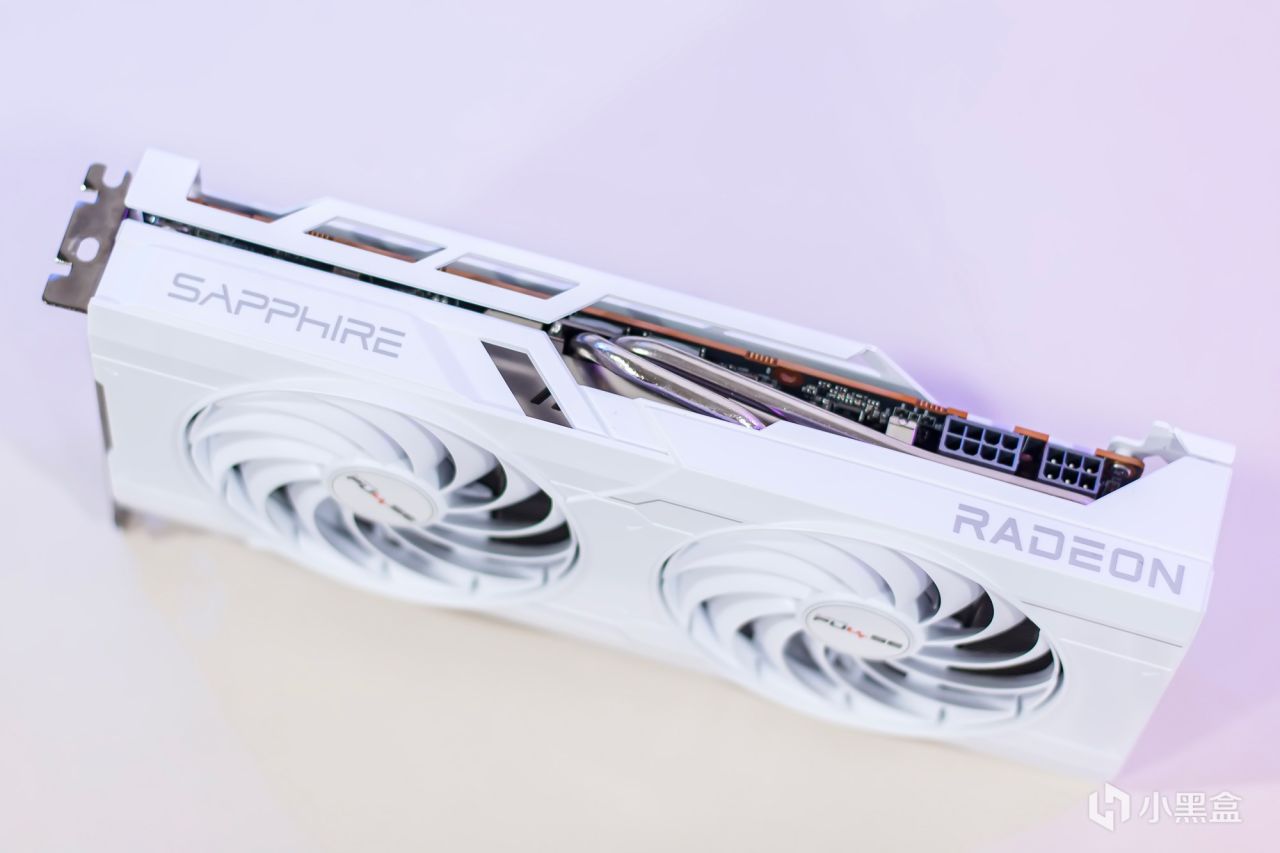 显卡共配备了两个散热风扇,位于扇叶中间有蓝宝石徽标的装饰件,散热风扇采用连框式扇叶结构设计搭配双滚珠轴承,使其具备不错的低噪音表现与耐久性,风扇同时支持智能启停技术,在待机等低功耗状态下会自行停止转动被动散热,有效降低运行噪音。