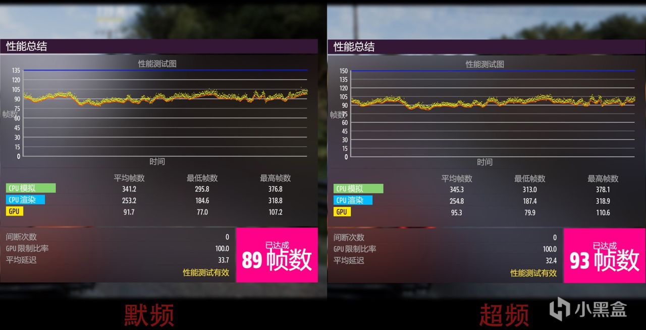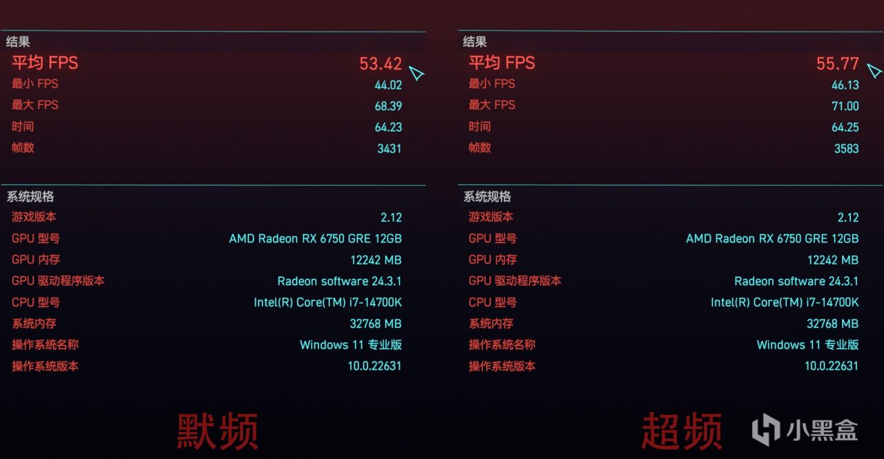 在《赛博朋克2077》的基准测试中,相较于默频帧率提高了2FPS左右,而《极限竞速:地平线5》中帧率提高了4FPS,核心温度没有太明显的变化,从个人角度来说,超频前后的游戏帧率并没多大差别,在超频后还可能会出现意想不到的稳定性问题,所以按照实际需求来决定是否超频。