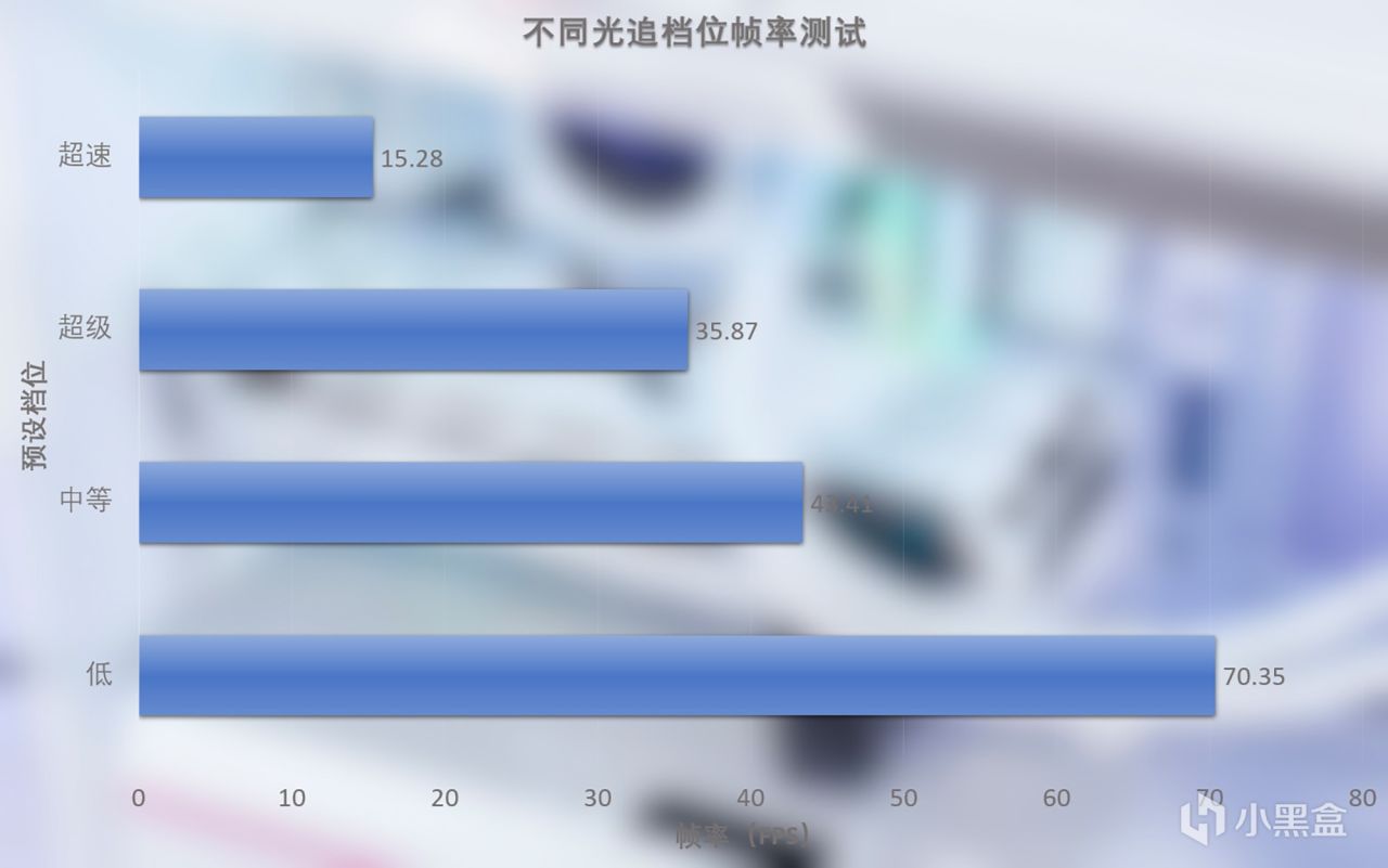 在光线追踪效果方面,游戏内置四个不同级别的光追档,分别是低、中等、超级与超速预设档位,分别进行基准测试,画面参数全为预设并无修改,低与中等档帧率分别为70.35FPS与43.41FPS,可尝试一玩,由于超速画面模式对硬件资源消耗极大,游戏帧率仅能达到15.28FPS,这还是开启FSR模式下,关了帧率估计仅有个位数。