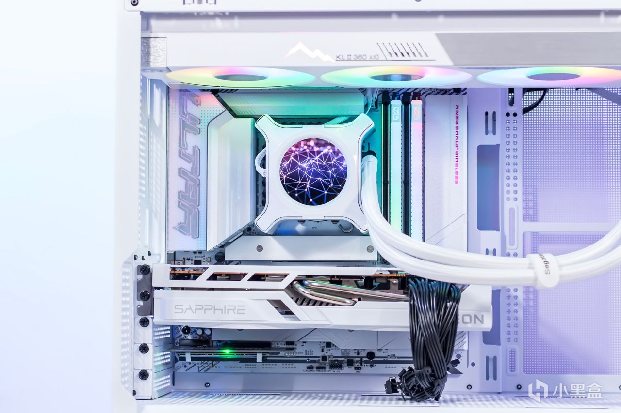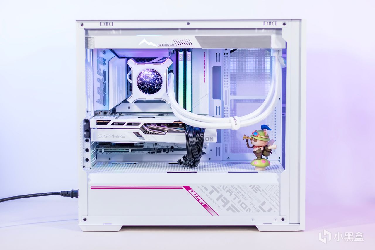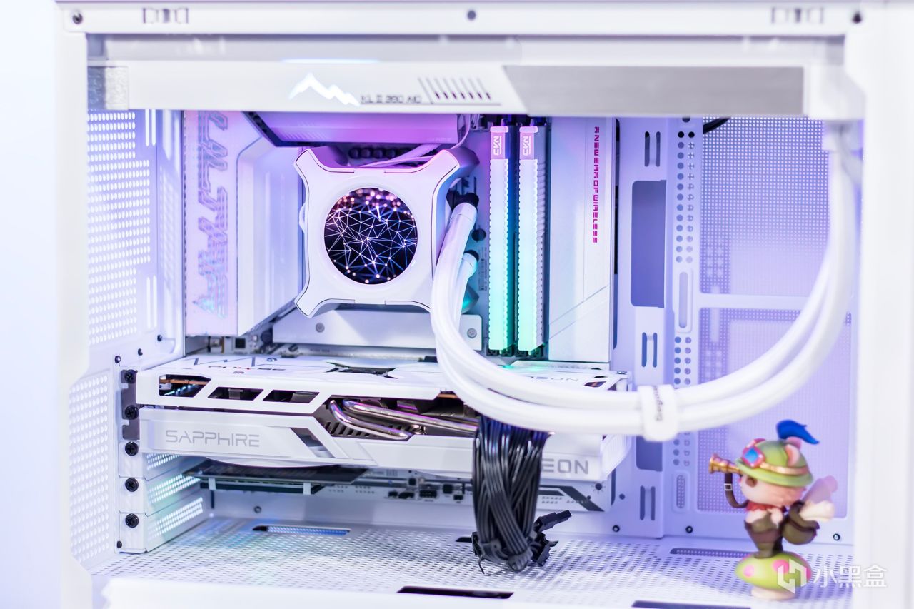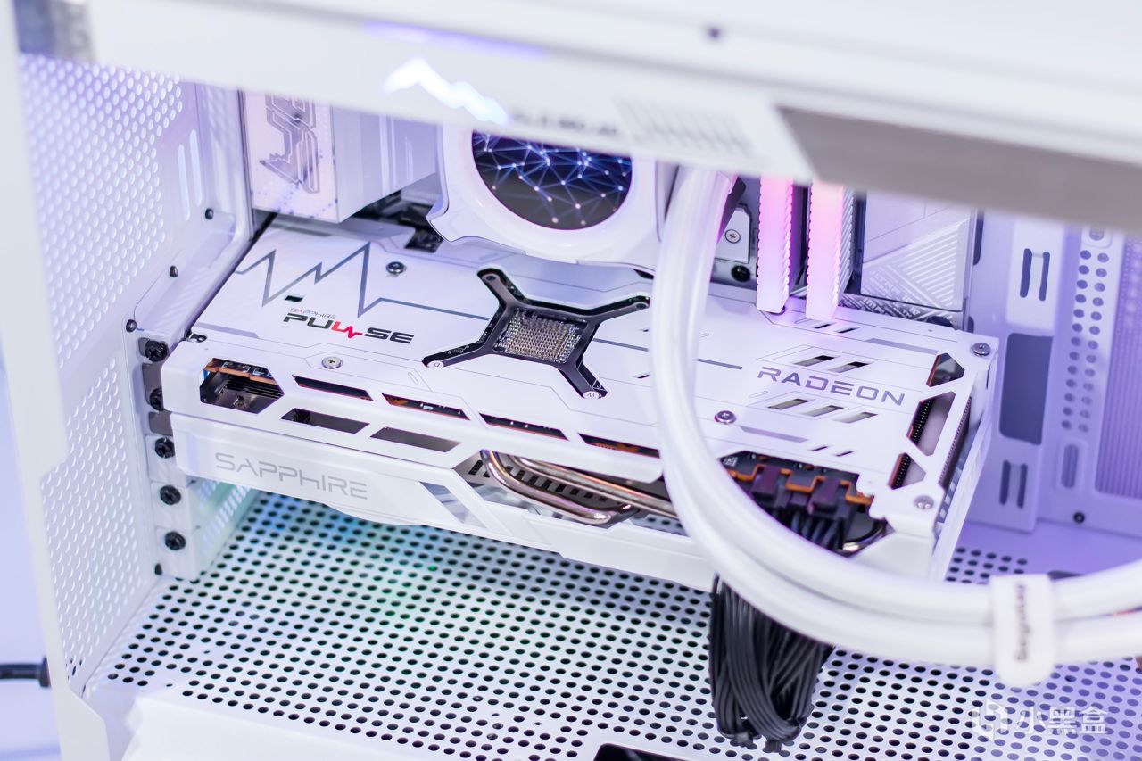 由于需要后期质保服务的原因,本次就不对这块显卡进行拆解,本次组装的是纯白色海景房风格的主机,蓝宝石RX 6750 GRE 12GB极地版显卡的外观设计,与主机的整体配色特别的搭配,由于显卡自身具有一定的重量,在实际当中搭配显卡支架让显卡受力更合理。