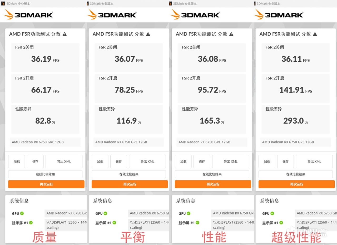 显卡支持AMD FidelityFX Super Resolution(简称FSR)显示技术,AMD在游戏开发者大会(GDC)中, 发布了FidelityFX超级分辨率(简称FSR)3.1版本,提升图像质量减少画面闪烁,在3DMark基准测试软件中具备FSR2功能测试,涵盖了质量、平衡、性能与超高性能四个不同档位,2K分辨率画面设置下,关闭与不同档位的性能差异分别为82.8%、116.9%、165.3%、293%,在理论测试中FSR2帧数的提升还是非常明显。