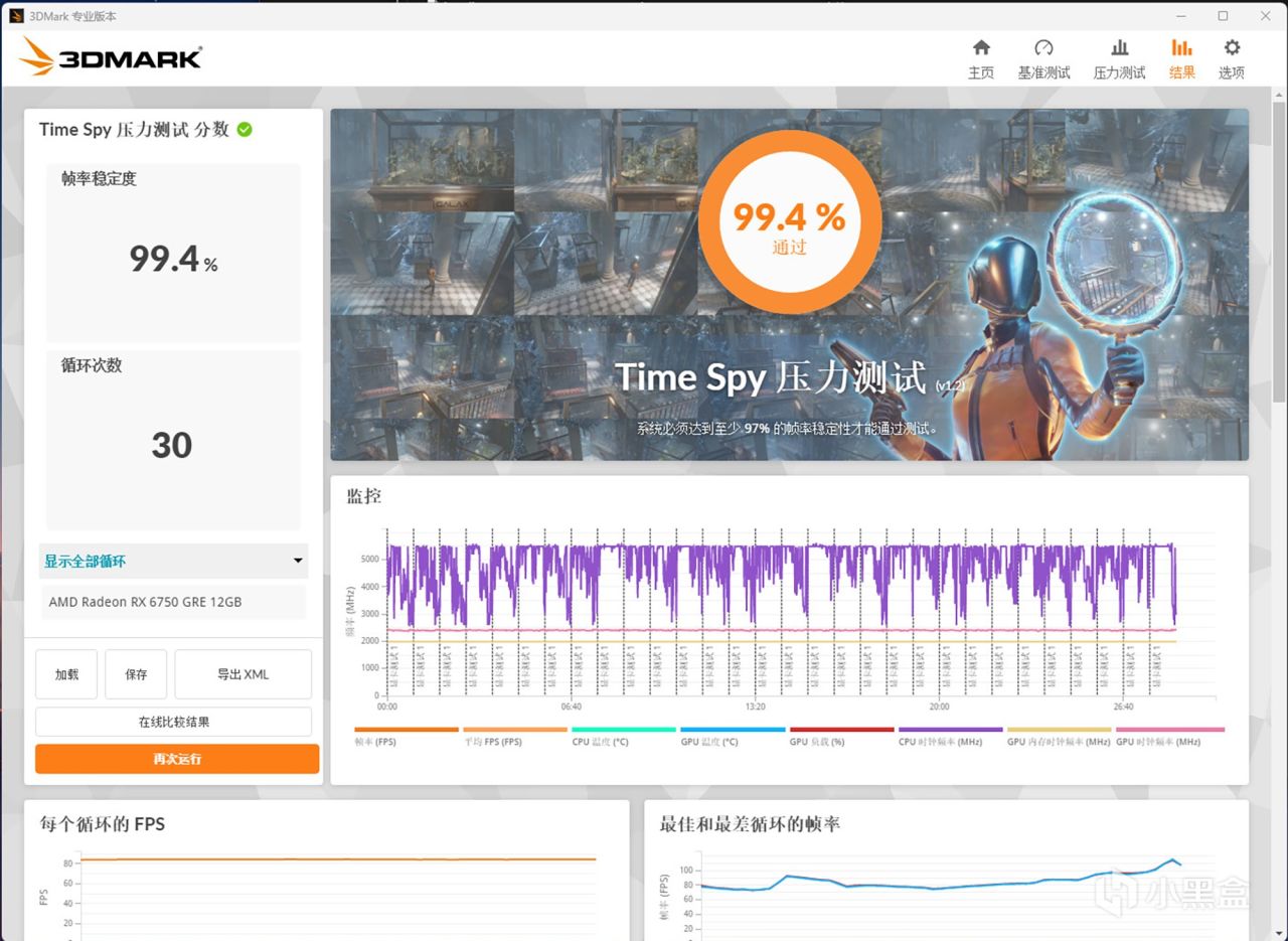 蓝宝石RX 6750 GRE 12GB极地版显卡的功耗与温度控制得相当好,当然,假如在控制面板中手动调节一下风扇转速,还可以进一步降低核心温度,利用3DMark基准测试软件对显卡进行三十次循环压力渲染测试,显示帧数稳定率为99.4%,性能释放平稳且持久。
