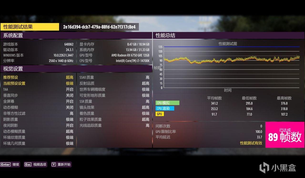 跑分归跑分还得看实际游戏的表现如何,进入实际游戏测试环节,以下全部游戏测试均在2K(2560×1440)分辨率下进行的,赛车大作《极限竞速:地平线5》,使用游戏内置的基准测试功能,选择预设极端档画面设置,开启TAA抗锯齿效果,关闭FSR,实测平均帧率为89FPS。