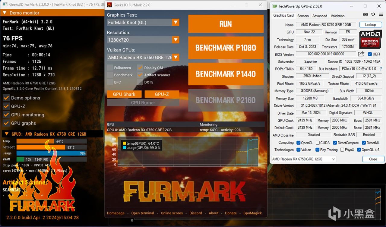 测试了不少游戏,相信大家已经知道这款显卡的大致性能水平,游戏性能测试就这里了,接下来对显卡进行压力测试,看下显卡的实际散热效能与运行噪音的表现,测试时室内温度约为28℃,先用FurMark2.2版对其烤机测试,软件显示满载时功耗为183W,对于一个配备四热管双散热风扇的显卡来说,散热压力不算特别高。