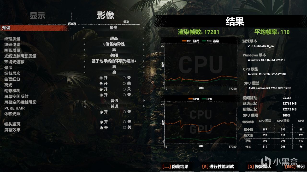 大型游戏《古墓丽影:暗影》,本次选择预设最高画质档位,利用游戏内置基准测试,实测蓝宝石RX 6750 GRE 12GB极地版显卡的平均帧率为110FPS,游戏是能够在开启光线追踪效果的,假如将全面画质选项拉满,平均帧率降至66FPS,光线追踪对GPU算力有极大压力。