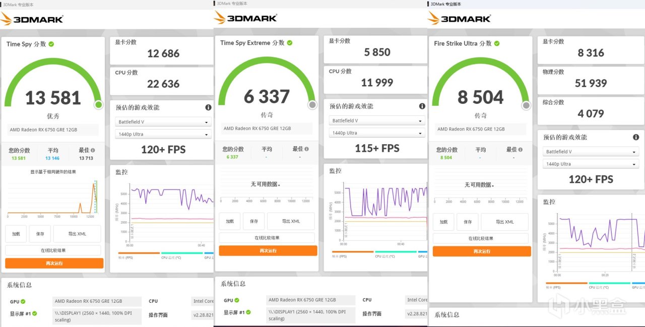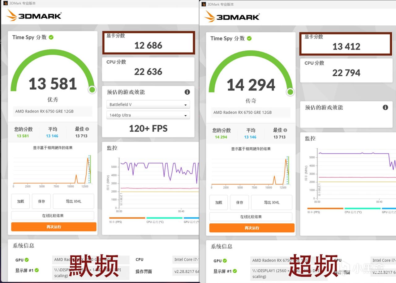 进行超频后需要适当使用3DMark或游戏进行压力测试是否稳定,利用3DMark的Time Spy项目进行基准性能测试,超频前的显卡分数为12686分,超频后得分为13412分,跑分成绩仅提高了5.72%。