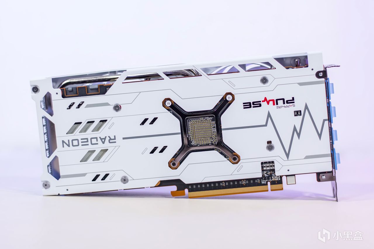 显卡配备一体式全尺寸金属背板,覆盖了这块PCB板,在背板表面还有一些品牌徽标与镂空设计,以便兼顾散热效果与装饰,显卡采用的是标准双槽厚度设计,其尺寸规格为260×120×49mm,较为短小轻薄的机身设计,让其在小机箱中的安装兼容性很不错。