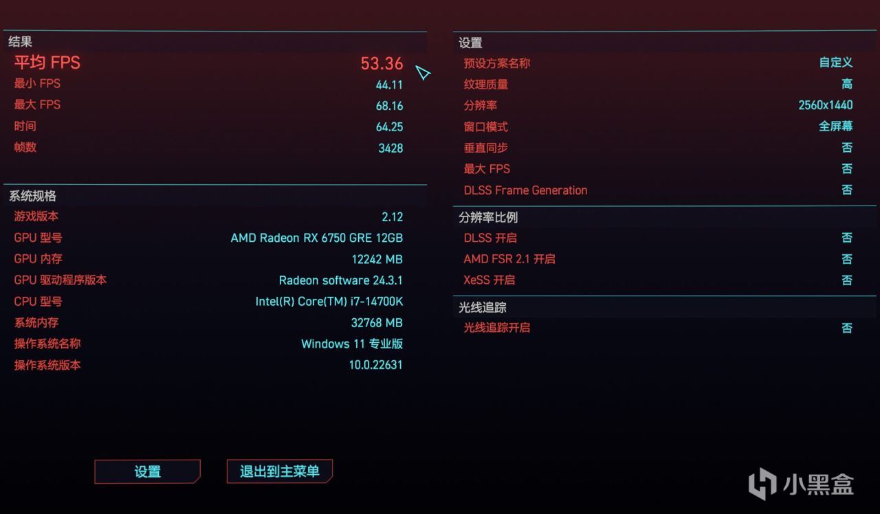 地平线5这游戏很吃显存,得益于12GB大容量显存加持,能够轻松开启最高画质设定,假如是8GB显存很容易出现显存不足的提示并影响画面流畅性,在《赛博朋克2077》游戏中选择预设超级画质档位,手动关闭FSR与光追效果,实测基准测试的平均帧数为53.36 FPS。