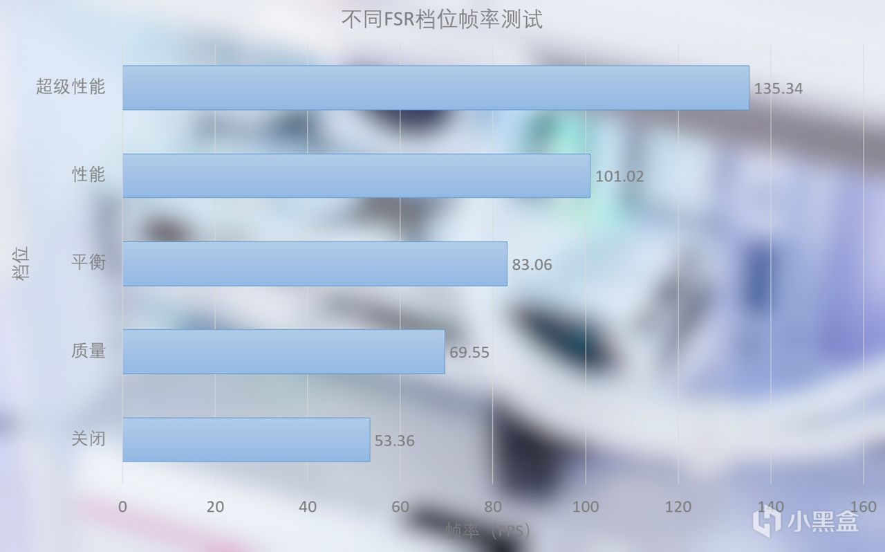 虽然在超级画质设定没达到60FPS的流畅线,但可通过FSR功能来提高帧率,游戏自身是支持FSR,分别测试四个不同档位的帧率,在质量与平衡档帧率分别提高至69.55与83.06FPS,个人不建议选择性能与超级性能档,开启后画面清晰度会明显下降,还不如减低画质档来得实际。