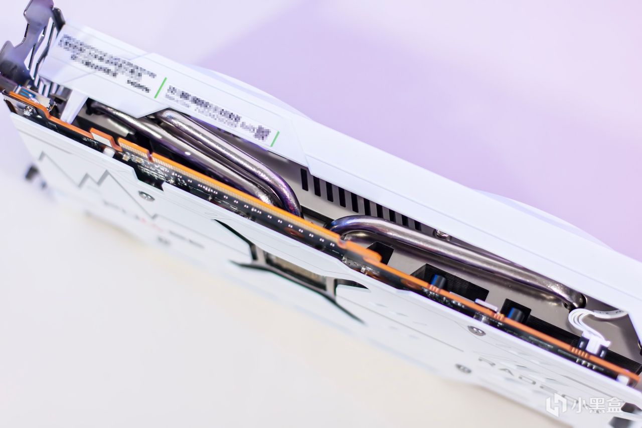 通过显卡的上下与后侧镂空格栅,能看到内部的散热鳍片以及导热管,铝质散热鳍片采用横向布局设计且十分密集,共配备四根镀镍导热管,从图中可见有五根热管从GPU核心处延伸至散热鳍片,其中两根为一整体,能够为GPU核心、显存以及供电元器件进行散热,形成了正面散热风扇处向内侧进风,从左右两侧排出的风道。