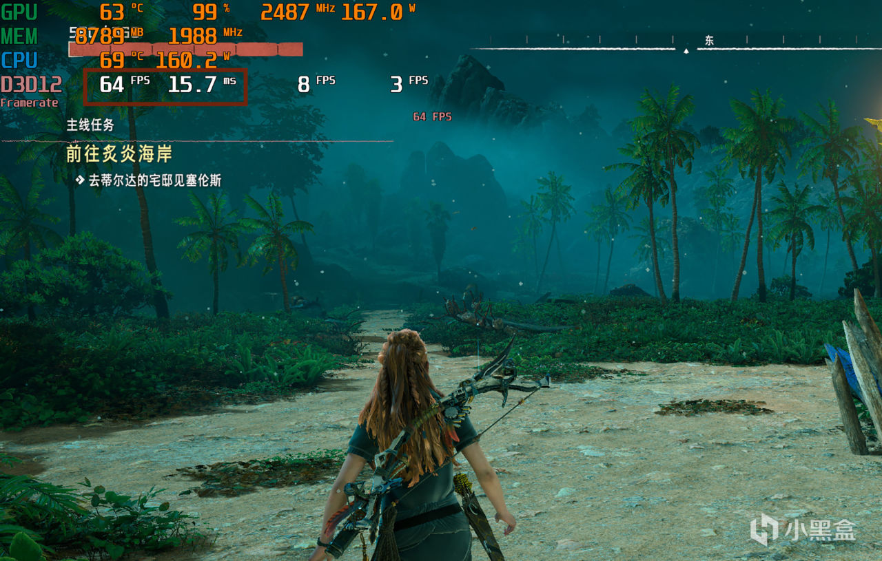 最近登陆PC平台的游戏《地平线:西之绝境》,在2K分辨率预设最高画质设定,关闭FSR效果,实测游戏帧率能够达到64FPS,由于游戏属于开放性地图,因此非常消耗显存,在一些场景下显存占用达到10GB,显卡所配备的12GB大显存优势得到体现。