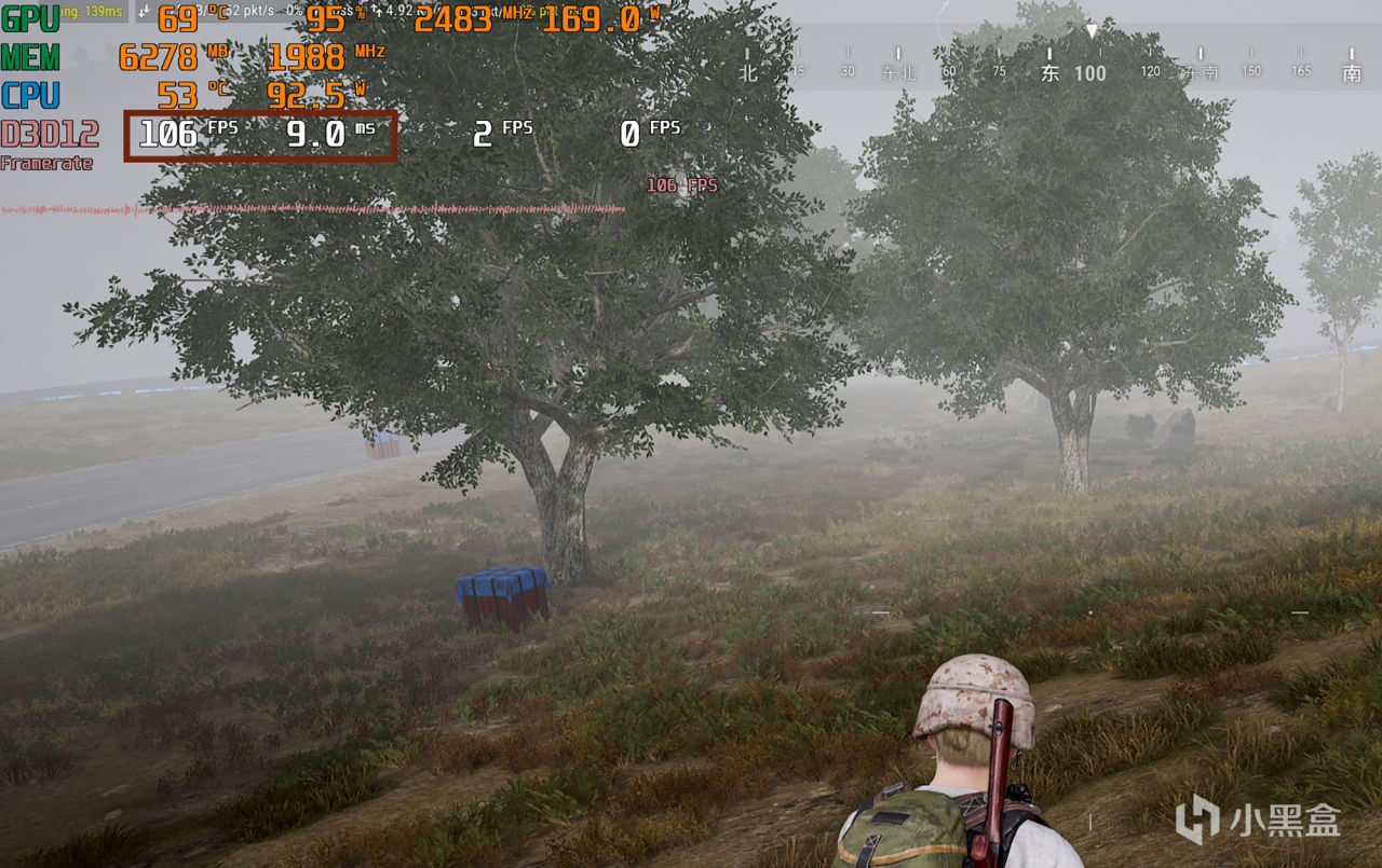 经典吃鸡游戏《PUBG》,预设超高画质设定,游戏场景为艾伦格地图,游戏帧率基本在106FPS徘徊,满足绝对流畅游戏需求完全没有问题,假如有更高流畅度要求,可使用三极致其它全低的画面设定,帧率会提升至190FPS左右,搭配高刷显示器能带来丝滑的游戏体验。